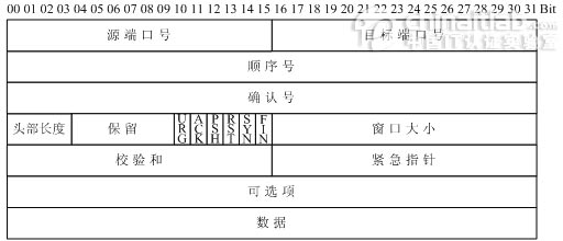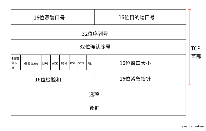 下图显示TCP首部的数据结构。如果不计任何可选字段的话,它通常是20个字节。