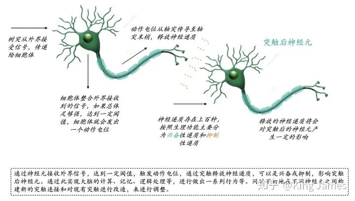 通过神经元接收外界信号,达到一定阈值,触发动作电位,通过突触释放神经递质,可以是兴奋或抑制,影响突触后神经元。通过此实现大脑的计算、记忆、逻辑处理等,进行做出一系列行为等。同时不断地在不同神经元之间构建新的突触连接和对现有突触进行改造,来进行调整。有时候不得不感叹大自然的鬼斧神工,900亿神经元组成的神经网络可以让大脑实现如此复杂的计算和逻辑处理。