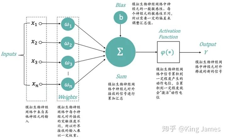 x_1,x_2,x_3,x_n:模拟生物神经网络中来自其他神经元的输入;ω_1,ω_2,ω_3,ω_n:模拟生物神经网络中每个神经元对外接收的突触强度不同,所以外界接收的输入乘以一定权重;Σ-Sum:模拟生物神经网络中神经元对外接收的信号进行累加汇总;Bias:模拟生物神经网络中神经元的一般敏感性。每个神经元的敏感性不同,所以需要一定的偏差来调整汇总值;Activation Function:模拟生物神经网络中信号累积到一定程度产生的动作电位,当累积到一定程度就会“激活”动作电位。实际使用时我们一般使用Sigmoid函数;Output:模拟生物神经网络中神经元对外释放的新的信号;
