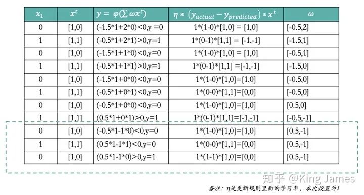 如上图,为了训练简单,我们训练集里面只有两条数据。同时激活函数,我们也是最简单的激活函数,当φ(∗) > 0时输出为1,当φ(∗) ≤ 0时输出为0。然后对于参数的更新规则Updated Rule,我们使用的Sequential Delta learning rule和Back Propag ation算法,该规则和算法不详细介绍了,可以理解为就像物理、数学领域一些科学家发现的普适性定理和公式,已经得到证明,用就完事了。因为Input只有1个值x_1,所以初始设定参数ω_1,同时还需要一个Bias,我们将Bias设定为ω_0。上述两个参数,我们需要从历史数据中学习出来,但是最开始我们需要一个初始值,假设初始值为ω_1 = 2, ω_0 = 1.5 ;然后我们通过不断地更新迭代最终ω_1和 ω_0将稳定在两个固定的值,这就是我们最终通过一个简单MP模型学习出来的参数。下图是整个更新迭代学习的过程: