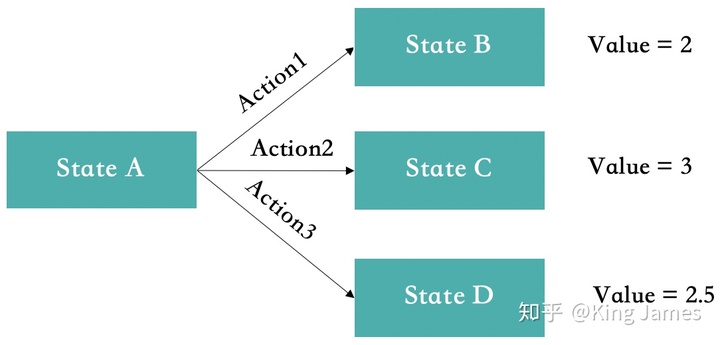 - 如何选择Action:简单来说,选择当前State下对应Value最大的Action。选择能够带来最大Value加成的Action。比如下图StateA状态下,可以采取的Action有3个,但是Action2带来的Value最大,所以最终Agent进入StateA状态时,就会选择Action2。(强调一点这里面的Value值,在强化学习训练开始时都是不知道的,我们一般都是设置为0。然后让Agent不断去尝试各类Action,不断与环境交互,不断获得Reward,然后根据我们计算Value的公式,不停地去更新Value,最终在训练N多轮以后,Value值会趋于一个稳定的数字,才能得出具体的State下,采取特定Action,对应的Value是多少)