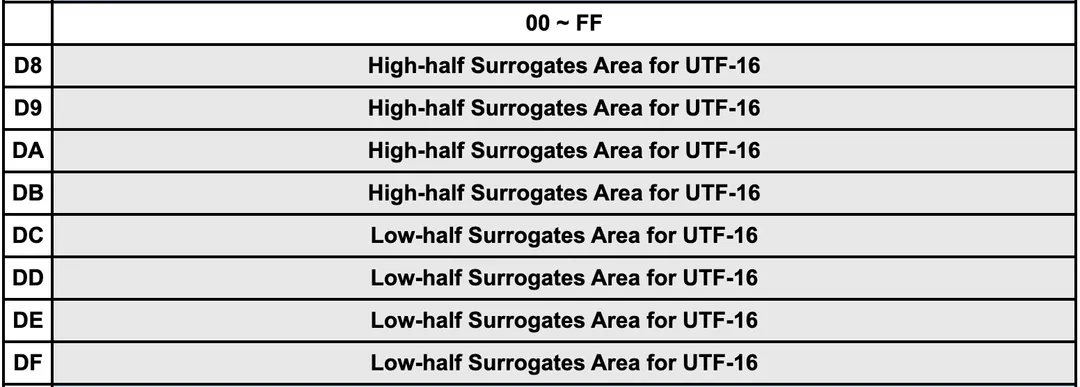 这里看似无解,但是 Unicode 标准单独给第一平面挖了一段 Block 来解决这个问题:在第一平面 0x0000 - 0xFFFF 中的 0xD800 - 0xDFFF 这段并没有编码含义,而是保留给 UTF-16 来使用: