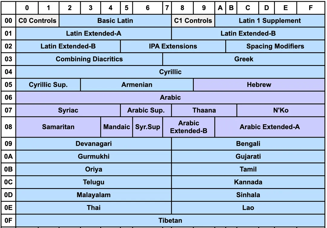 Block 是对 Plane 进一步的划分,比如在 BMP 0x0000~0xFFFF 这个平面中,最开始的 128 位是 ASCII 编码, 从官网给出的 Plane 划分来看,区块就是表格(平面)的这些格子: