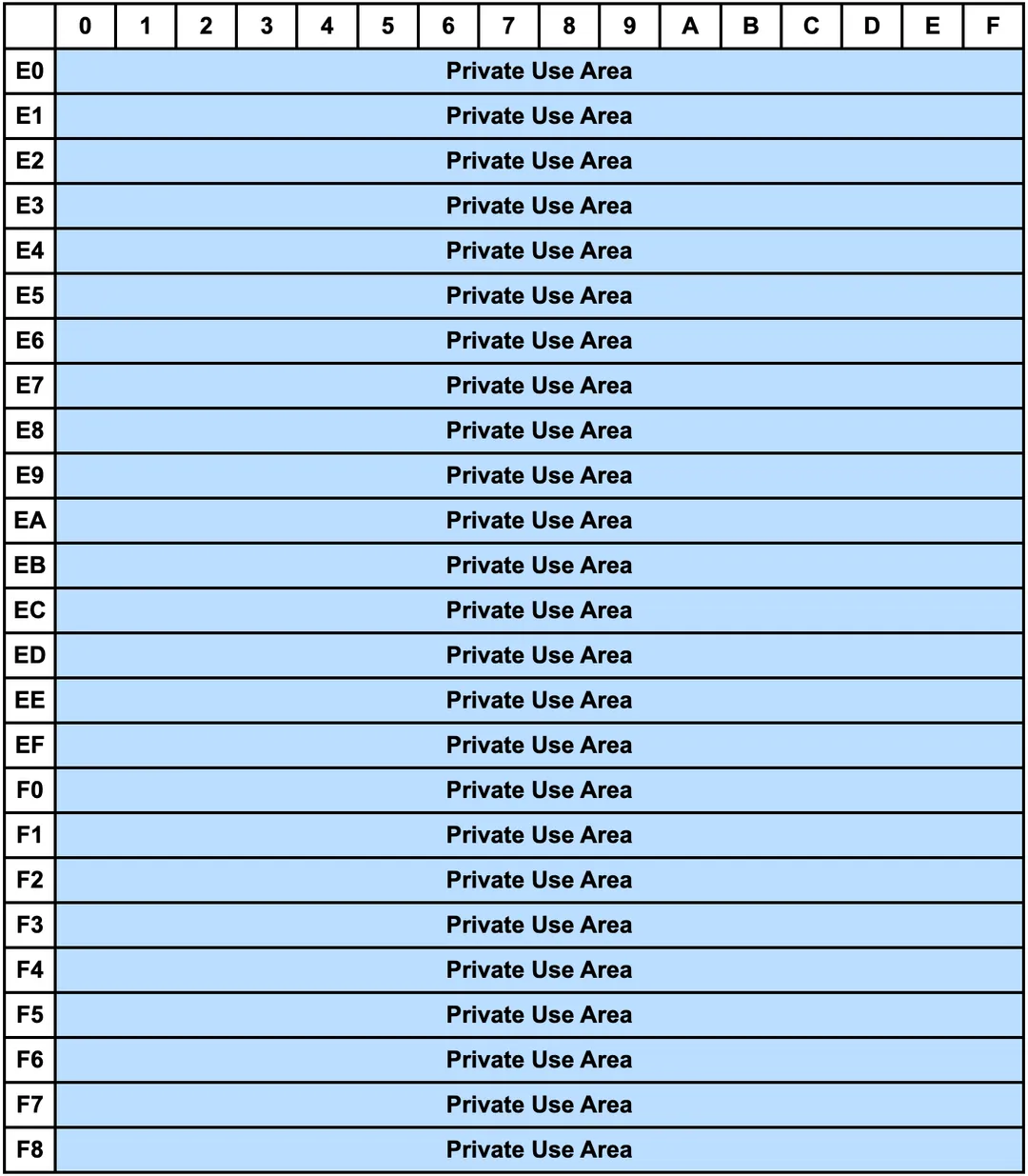 前面提到的 Unicode 平面里的 15 和 16 号平面是所谓的 A区 和 B区 这两个区间是保留给开发者做私有化定义的,而除了这两个平面外,在第一平面 BMP 内下面这个区块 0xE000 ~ 0xF8FF 也是一样的功能,用来用作 private use 的,共计 6400 个: