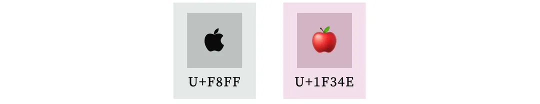 比如苹果系统的一个私有字符「 U+F8FF」就是在上面这个 Block 内的:(F8FF 是上面这个区域的最后一个位置,注意如果你不是苹果系统看不到这个 🍎 字符,苹果系统下 shift+option+k 可以输入这个字符)