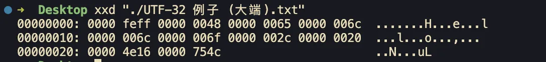 你可能会发现开头的四个字节 00 00 FE FF 貌似没有用到,实际这四个字节叫做 UTF BOM (Byte Order Mark) 是用来标记字节序的,此处表明是大端字节序,表示高位字节存储在左边,而如果是 0xFEFF0000 则代表是小端存储,此时高 16 位和低 16 位顺序要调转一下,即: