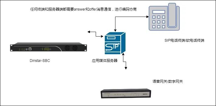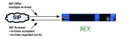 以上是一个关于带物理DSP的SIP话机简单编码协商流程。除了SIP终端之间的协商以外,我们在生产环境中还会看到网关产品的编码协商处理的使用场景。现在,我们通过一个语音网关的编码协商的示例来说明编码协商是如何进行的。再次说明,这里的示例仅是某个厂家的网关的简单示例(多个“m=”行支持),可能和其他厂家的处理机制在细节上有所差别,但是原理基本上都是一致的(遵从RFC 3264规范)。示例中,网关通过offer/answer交互模式,通过第一个“m=”行和端口设置(m=0)接受了所需要的媒体格式,拒绝了不能支持的媒体。注意,这里的编码优先级不会影响offer中编码的选择,仅影响answer中编码选择方式。