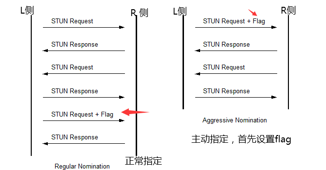 标识成功配对以后,接下来,ICE就会指定agent的功能角色。其中一个agent称之为CONTROLLING AGENT(主控agent),另外一个agnet是CONTROLLED AGENT(被控agent)。主控agent就会从有效的候选配对中指定一个配对来应对媒体处理。主控agent通过两种方式来实现指定候选配对:使用regular nomination或者使用aggressive nomination的方式来指定候选配对。
