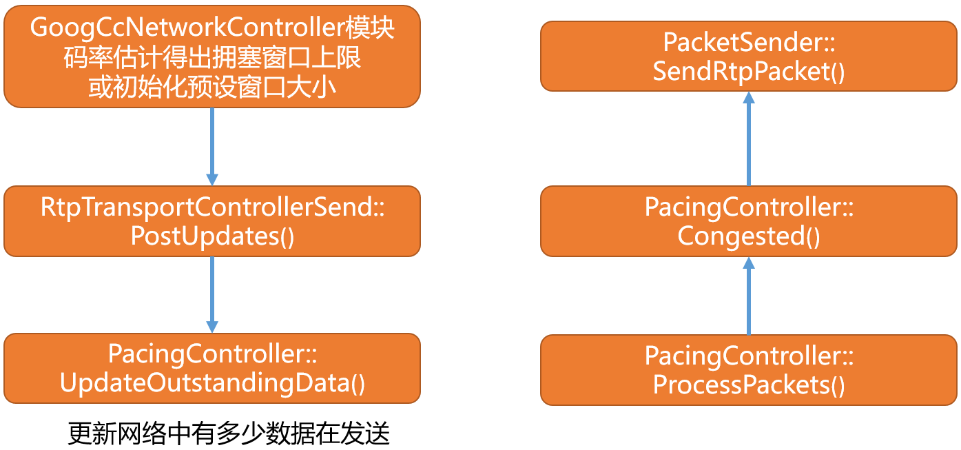 经RtpTransportControllerSend::PostUpdates()函数将拥塞窗口上限配置到pacer模块。