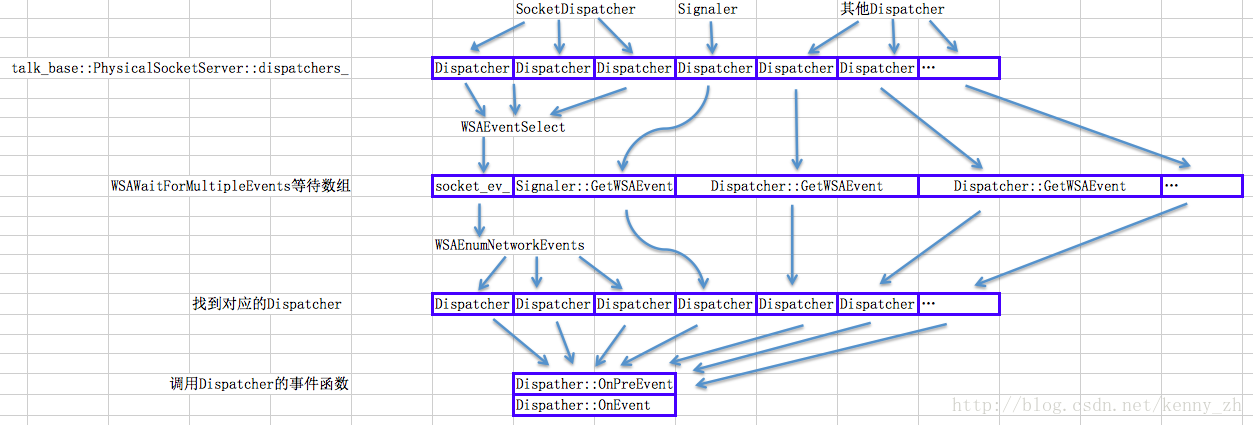 与这些框架相比,WebRTC的多线程模型还是比较特别的。它的核心是类似于WSAWaitForMultipleEvents的多路信号分离器。这是我最喜欢的多线程模型。它使每条线程既可以处理消息(post、send),同时也可以处理多个IO。并且在必要的情况下让一条线程独占(管理)一些资源,避免过多的使用锁造成线程死锁。个人认为这种模型可以帮助开发人员更容易地实现快速响应的界面程序。