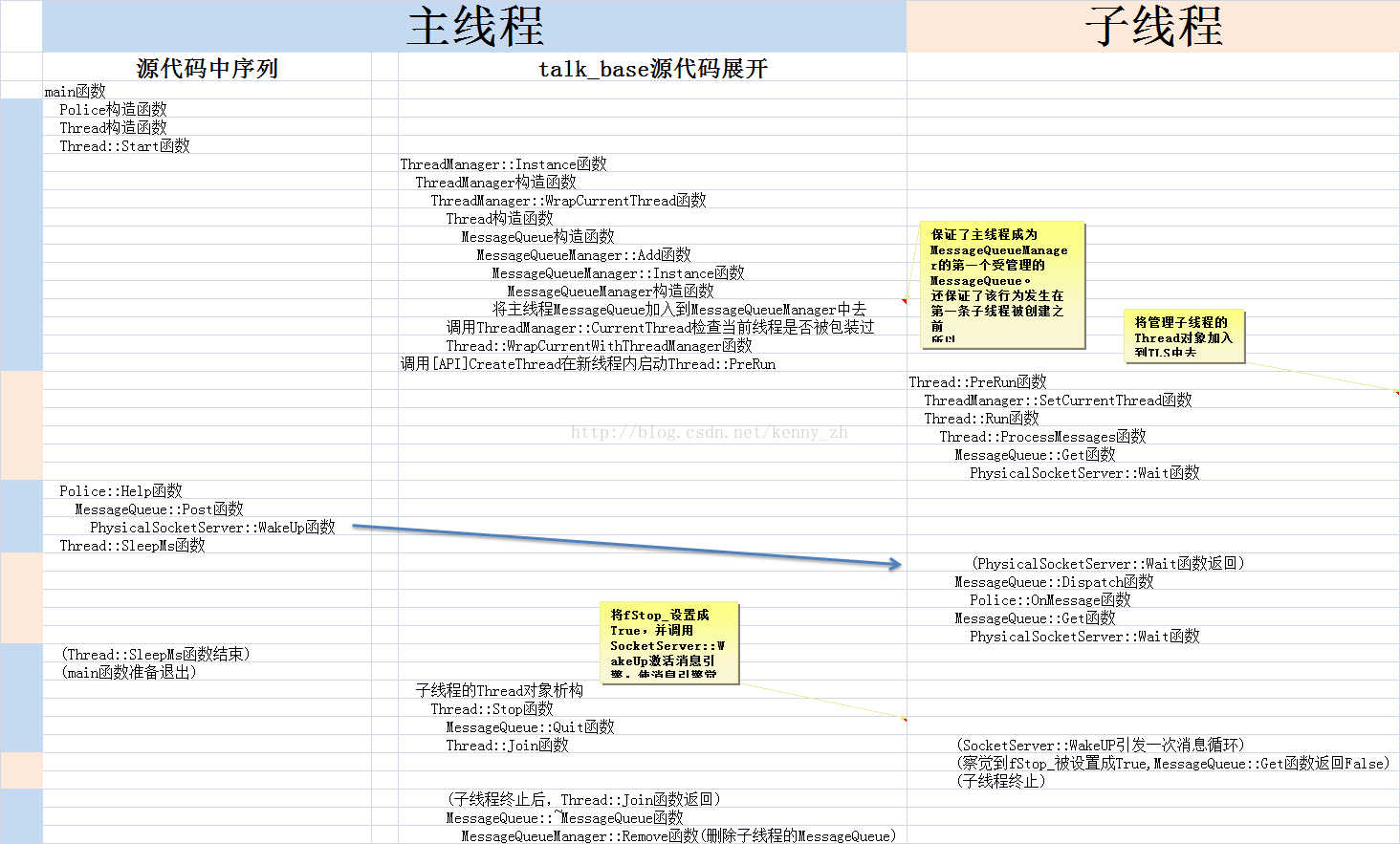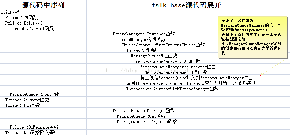 以上的描述可能比较晦涩难懂,这是因为整个流程涉及到了rtc::Thread和rtc::ThreadManager等类。而这些都是尚未讲解过他们的代码。不过即使看不明白也没关系,我会在讲解完所有相关类之后演示2段范例代码,并将范例代码的调用栈完全展开。看过范例代码后绝大多数读者都应该能够明白rtc::MessageQueueManager的原理。