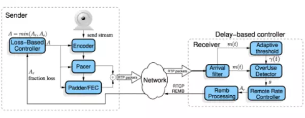 众所周知,WebRTC的拥塞控制和码率估计算法采用GCC算法[1]。该算法充分考虑了网络丢包和网络延迟对码率估计的不同影响,分别基于丢包率和网络延迟进行码率估计,最后综合这另种码率得出最优值。在算法实现上,基于丢包率的码率估计在发送端进行,基于网络延迟的码率估计在接收端进行。最后在发送端计算出最优值,作用于Codec和PacedSender模块。GCC算法能够较好地基于网络实时状况估计网络带宽,为网络实时通信应用打下坚实基础[2][3][4]。