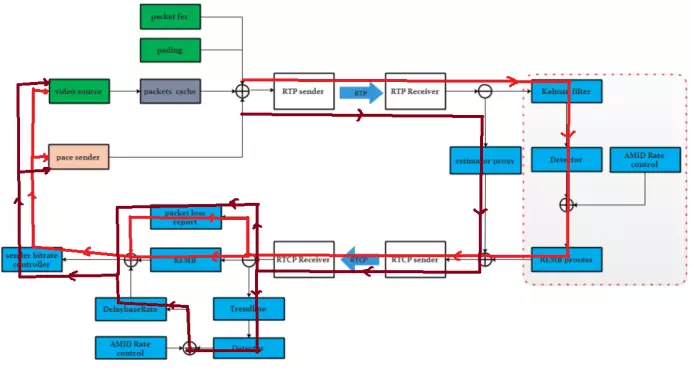 图4中棕色线是Sendside-BWE算法的数据控制流回路:发送端在发送RTP数据包时,在RTP头部扩展中设置传输层序列号TransportSequenceNumber;数据包到达接收端后记录该序列号和包到达时间,然后接收端基于此构造TransportCC报文返回到发送端;发送端解析该报文,并执行Sendside-BWE算法,计算得到基于延迟的码率Ar;最终Ar和基于丢包率的码率As进行比较得到最终目标码率,作用到PacedSender和Codec模块,形成一个完整的反馈回路。图4中红色线是GCC算法的数据控制流回路:发送端在发送RTP数据包时,在RTP头部扩展中设置绝对发送时间AbsSendTime;数据包到达接收端后记录该绝对到达时间,然后基于此执行GCC算法得到Ar,最后构造REMB报文把Ar发送回发送端;发送端基于Ar和As得到最终目标码率,作用到PacedSender和Codec模块,形成一个完整的反馈回路。