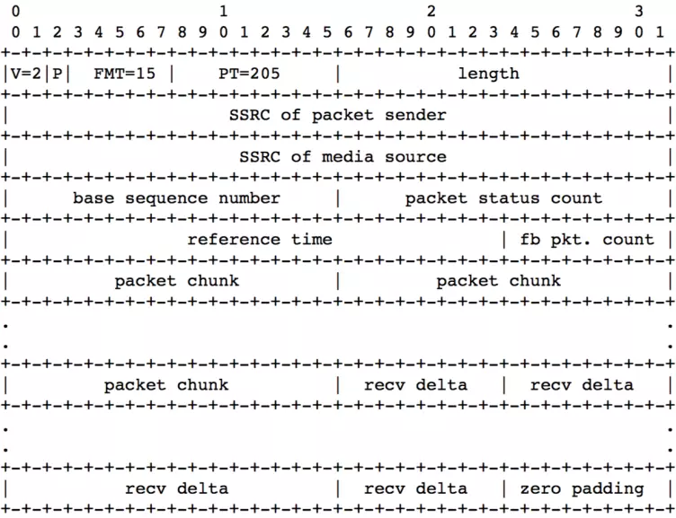 RemoteEstimatorProxy作为Sendside-BWE在接收端的代理,其实现遵从WebRTC的模块机制,在Process线程以100ms为发送周期发送TransportCC报文[9],发送周期会根据当前码率动态调整,其取值范围在[50ms, 250ms]之间,其本身可用的发送码率为当前可用码率的5%。TransportFeedback报文是一种RTP传输层feedback报文(pt=205),FMT为15。其格式如图7所示: