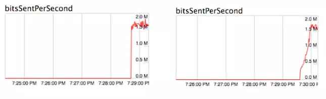 实际测试表明,和GCC算法相比,SendsideBWE算法在快速码率估计、码率估计准确性、抗网络抖动等方面都具有非常大改善。由于保密原因,此处不能发布内部测试数据,仅贴出一组公开渠道获得的快速码率估计比较图[10]。