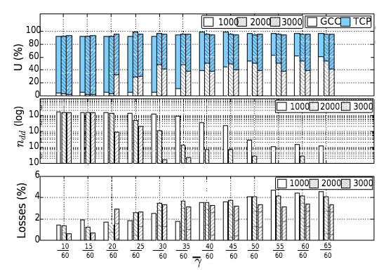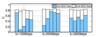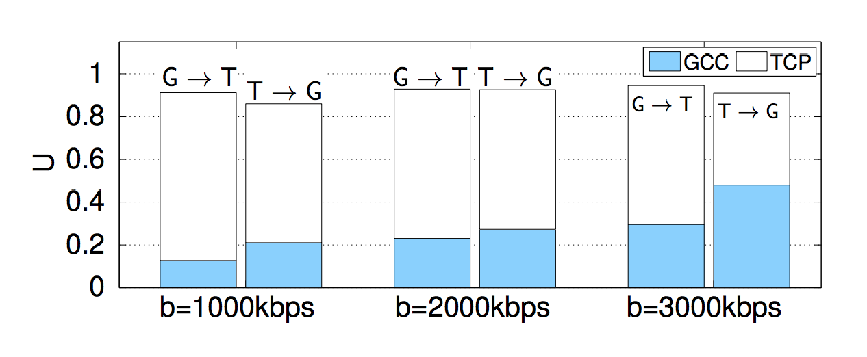 - GCC流的信道利用率随着带宽的增加而增加,且普遍低于TCP流的带宽占用率
