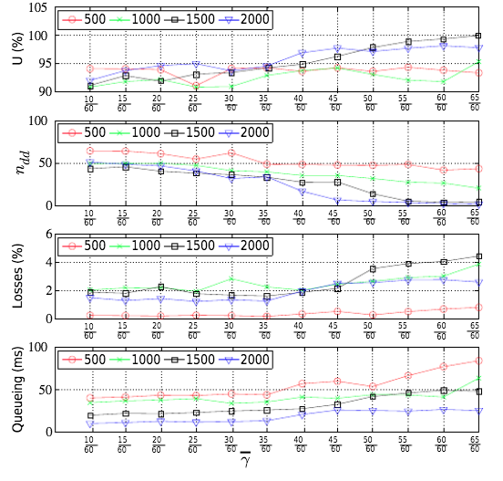 - 随着门限值的增加,GCC算法偏向于Loss-based BWE,进而带宽占用率逐渐增加,其后果是更大的丢包率和队列延迟。