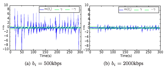 设置[Math Processing Error]RTTm=50ms,可利用带宽[Math Processing Error]bi=1000kbps,仿真结果如下: