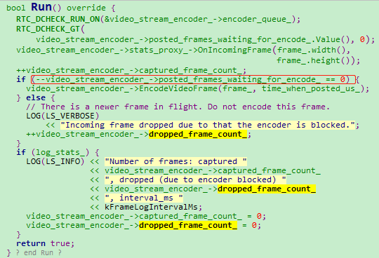 发送端若出现采集帧率大于编码帧率也会主动掉帧,这个掉帧在VideoStreamEncoder::EncodeTask::Run函数处理。