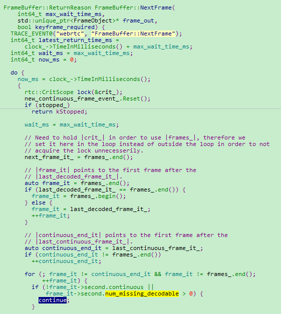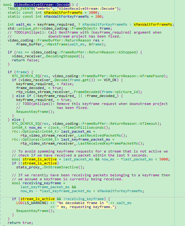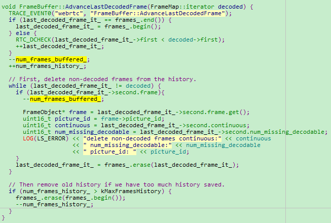 做过视频会议都清楚,当网络出现丢包异常后,经常会导致视频出现长时间花屏问题。严重降低用户体验。测试webrtc发现,视频无论在什么环境,都没有出现花屏现象。若出现丢包,通过掉帧方式解决该问题。最坏的情况就是视频出现卡顿,但是也不会出现花屏。我们都知道视频解码器只管数据解码,不会判断是否是花屏,这个丢包导致花屏问题,只能在调度侧解决,解码器是不处理该异常的。