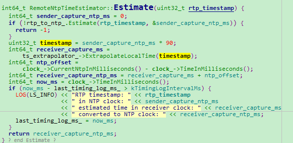 RtpToNtpEstimator::Estimate:根据UpdateParameters计算出来的媒体采样帧率和起始偏移,和新进入的媒体时间戳,计算新进入帧的视频采集绝对时间。