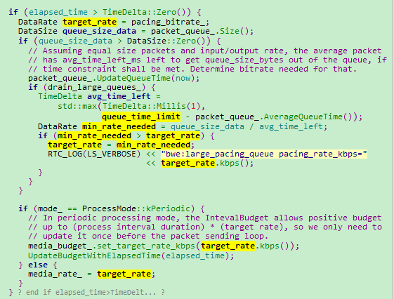 PacingController::ProcessPackets被定时触发后,会计算当前时间和上次被调用时间的时间差,然后将时间差参数传入media_budget_,media_budget_算出当前时间片网络可以发送多少数据,然后从pacer queue当中取出报文元数据进行网络发送。
