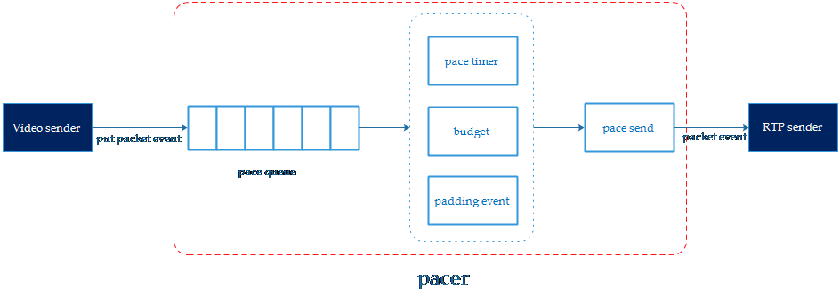 所以音视频数据编码和RTP切分打包后,首先将RTP报文存在pace queue队列,并将报文元数据(packet id, size, timestamp,重传标示)送到pacer queue进行排队等待发送,插入队列的元数据会进行优先级排序。
