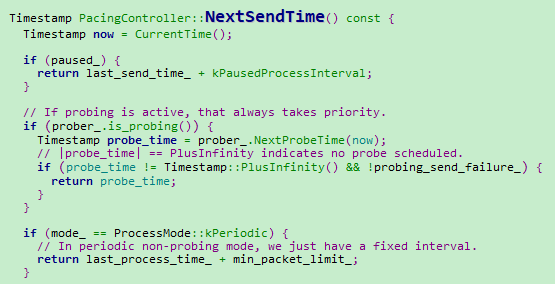 PacingController::NextSendTime在控制发送节奏上,有两种模式kPeriodic、kDynamic。kDynamic还没理解透,这里先记录kPeriodic实现方式。