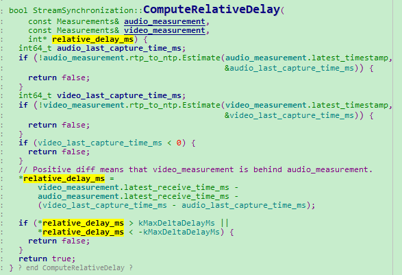 StreamSynchronization::ComputeRelativeDelay用来计算(音视频渲染different time- 音视频采集different time)