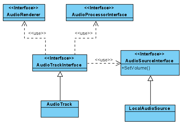 AudioSourceInterface:概念上同VideoSourceInterface类似,抽象音频源接口供AudioTracks使用,但是从源码中理解,这是个伪概念,因为没有提供一个类似于VideoCapturer的AudioCapturer接口,这里没有音频的采集逻辑,实际上WebRTC的音频采集接口使用的是AudioDeviceModule,在创建PeerConnectionFactory的时候可以由外界定制,如果没有,则内部创建AudioDeviceModuleImpl来实现此接口完成音频设备的采集工作。可能是功力不够,反正我是不太理解音频采集和视频采集这种设计的不对称性。如果也封装一个AudioCapturer接口的概念,这样可定制性是不是可以更高。