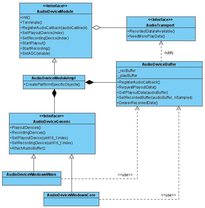 AudioDeviceModule是个大而全的接口,恨不得将所有音频相关的接口都封装在里面(实际也差不多了),具体包括:枚举音频采集设备(Record)和播放设备(Playout)、设置当前的采集设备/播放设备、开始/停止音频的采集/播放、设置音频增益控制开关(AGC)等。AudioTransport是个关键的对外接口,负责音频数据的传入(调用NeedMorePlayData方法,供Playout使用)和输出(调用RecordedDataIsAvailable方法,数据由Record采集操作产生)。