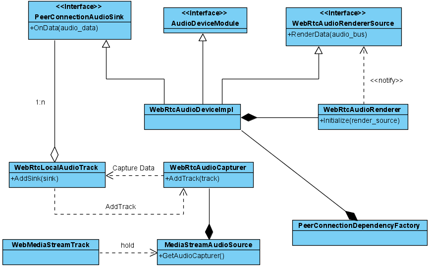 根据WebRTC的本地音频接口设计,Chromium提供了一个WebRtcAudioDeviceImpl类来实现AudioDeviceModule接口,该类对象由PeerConnectionDependencyFactory负责创建和维护,结构如下: