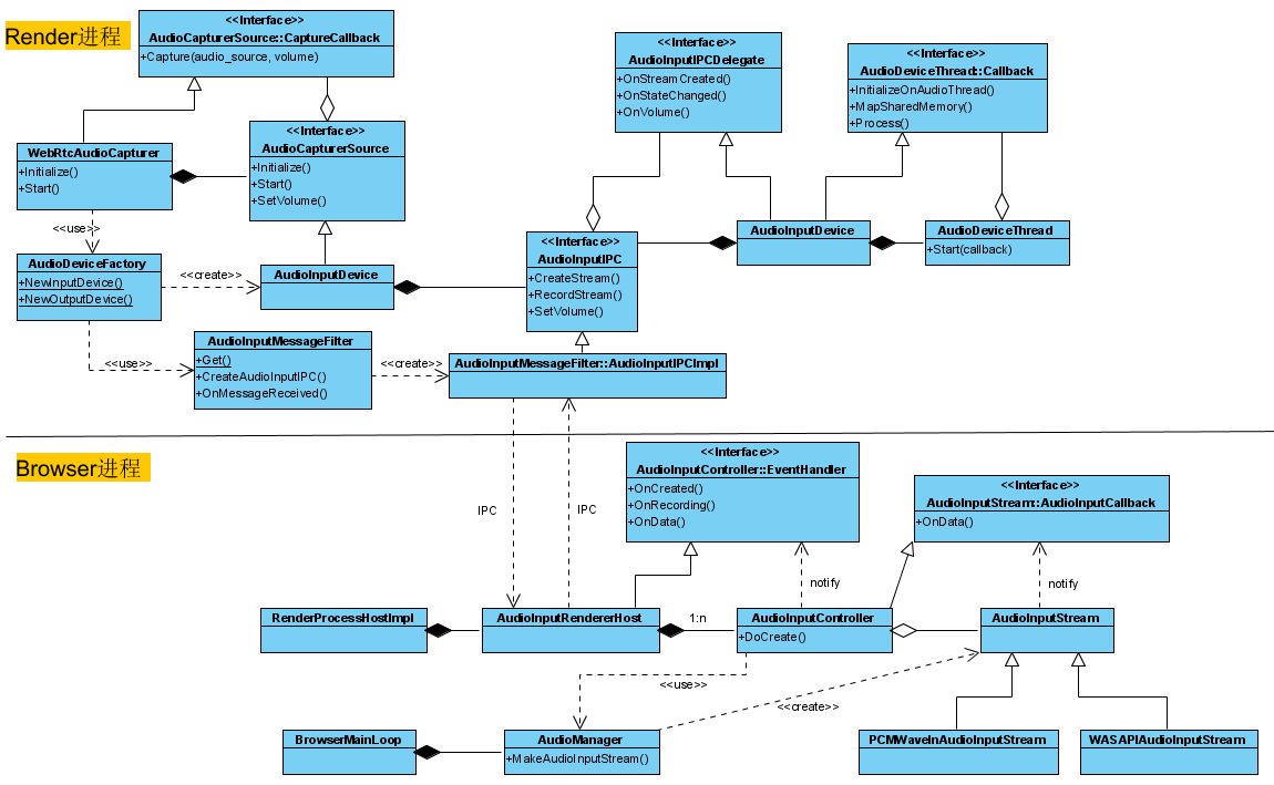 这是WebRtcAudioCapturer采集音频数据的结构,牵涉到跨进程通信,结构还是非常复杂的。WebRtcAudioRenderer的结构就不准备介绍了,因为Chromium的这块设计非常具备对称性,基本上图中类命名中的Input改成Output就差不多是WebRtcAudioRenderer的架构了。