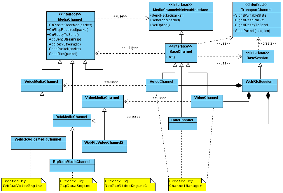 前面两篇博文完整地介绍了WebRTC音视频的采集模块,接下来应该开始介绍关键的音视频编码模块。不过在介绍音视频编码模块之前,需要介绍一下Channel概念,WebRTC的每路数据的传输流程都封装成一个Channel对象。详细UML图如下: