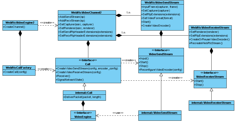 MediaChannel及其派生类封装了待传输的编解码、RTP/RTCP封包解包等逻辑,具体对象由相应的Media Engine类创建,如图:视频Channel最终的实现类WebRtcVideoChannel2由WebRtcVideoEngine2创建,音频Channel最终的实现类WebRtcVoiceMediaChannel由WebRtcVoiceEngine创建。
