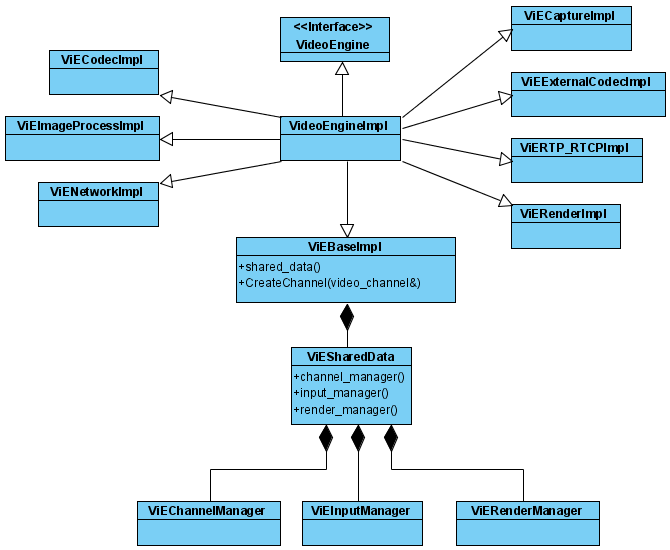 VideoEngine模块里有ViEBase、ViECodec、ViECapture、ViEImageProcess、ViENetwork、ViERender、ViERTP_RTCP、ViEExternalCodec接口,注意,这些都是功能性的接口,它们相应的实现分别对应于上图中的XXXImpl类,VideoEngineImpl类从所有的XXXImpl接口派生,因此外部有了VideoEngine接口,都可以通过强转的方式获取ViEBase、ViECapture等之类的接口(根据VideoEngine强转成相应的接口的逻辑封装在目标接口的GetInterface静态方法中),外界可以通过这些接口来完成视频数据做相应的设置,而这些设置最终都反映到一个名叫ViESharedData的类对象里。该对象由ViEBaseImpl创建并在各接口的实现之间共享,XXXImpl可以通过ViEBaseImpl的shared_data方法来访问,用于共享的数据有三类:ViEInputManager、ViEChannelManager和ViERenderManager。下面分别介绍一下这关键的三个对象。