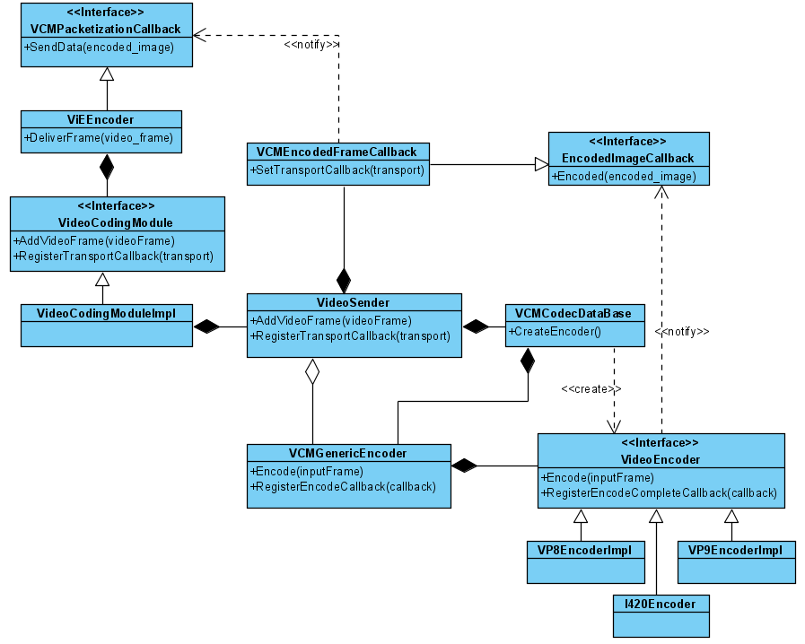ViEChannelManager维护了ViEEncoder和ViEChannel对象,ViEEncoder实现了ViEFrameCallback接口从ViECapturer对象中接收视频帧数据,ViEEncoder对接收到的视频帧数据进行编码,然后将编码后的数据传给ViEChannel(通过两者之间共享的PayloadRouter对象),ViEChannel将编码后的视频数据通过RTP/RTCP协议发送出去。下面分别分析一下ViEEncoder和ViEChannel。