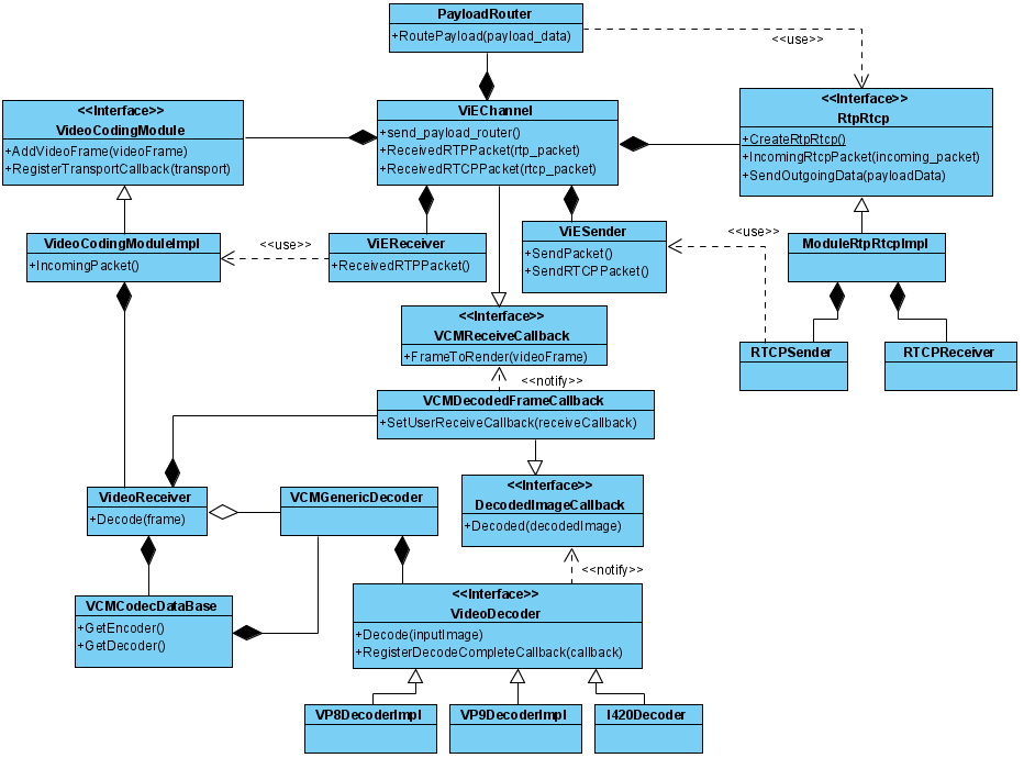 当WebRtcVideoChannel2接收到网路数据包后(通过OnPacketReceived或OnRtcpReceived方法响应),会在VideoReceiveStream对象中通过VideoEngine模块暴露出去的ViENetwork接口来响应数据包处理,最终触发到ViEChannel的ReceivedRTPPacket或ReceivedRTCPPacket方法。ViEChannel中将接收并解码网络视频数据的任务分配给ViEReceiver对象。ViEReceiver先调用RTP/RTCP模块做协议的解析(图中限于篇幅未标注出来),解析完成后调用VideoCodingModule模块进行数据的解码操作(参见ViEReceiver的OnReceivedPayloadData方法),VideoCodingModule模块内部维护了一个与VideoSender对应的VideoReceiver来完成解码逻辑,这块与VideoSender的编码逻辑完全对称,这里不再表述。