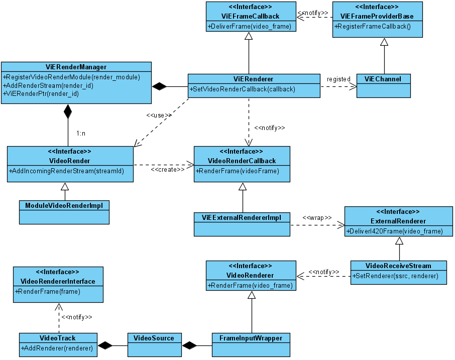 当ViEChannel接收到网络数据解包并解码后,就会开启触发渲染流程(参见FrameToRender方法),ViEChannel会调用向其注册的ViEFrameCallback接口来派发视频帧数据。ViERenderManager维护了一个ViERenderer对象来实现ViEFrameCallback接口, 它将数据进一步派发,最终通过ExternalRenderer接口派发给WebRtcVideoChannel2的VideoReceiveStream对象。VideoReceiveStream通过VideoSource设置进来的VideoRenderer接口将数据派发给VideoTrack,用户可以挂接VideoRendererInterface接口来接收视频帧数据。真够绕的,而且那么多命名的相似性(比如VideoRender/VideoRenderer),感觉各模块开发期间,都实现了自己的一套接口规范,最后强行串在一起了。