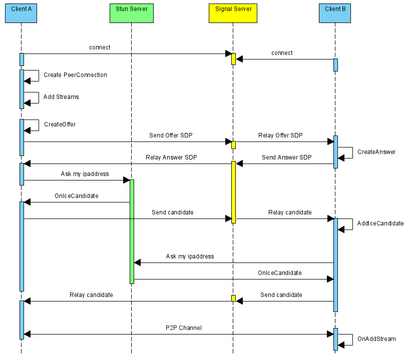 上述序列中,WebRTC并不提供Stun服务器和Signal服务器,服务器端需要自己实现。Stun服务器可以用google提供的实现stun协议的测试服务器(stun:stun.l.google.com:19302),Signal服务器则完全需要自己实现了,它需要在ClientA和ClientB之间传送彼此的SDP信息和candidate信息,ClientA和ClientB通过这些信息建立P2P连接来传送音视频数据。由于网络环境的复杂性,并不是所有的客户端之间都能够建立P2P连接,这种情况下就需要有个relay服务器做音视频数据的中转,本文本着源码剖析的态度,这种情况就不考虑了。这里说明一下,stun/turn、relay服务器的实现在WebRTC源码中都有示例,真是个名副其实的大宝库。