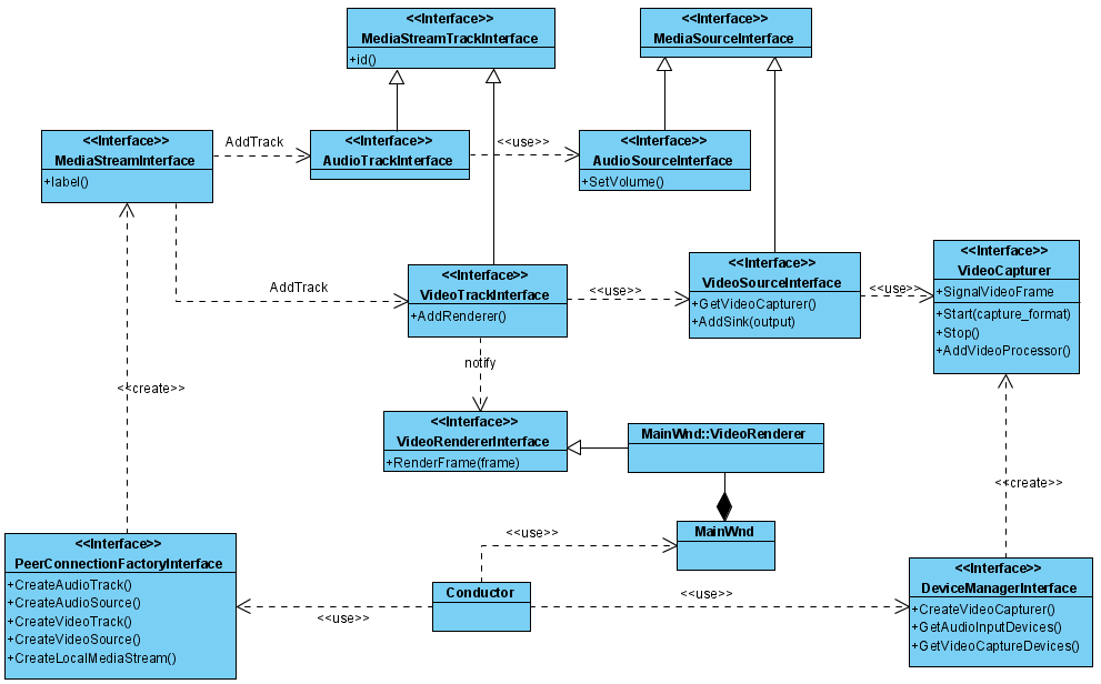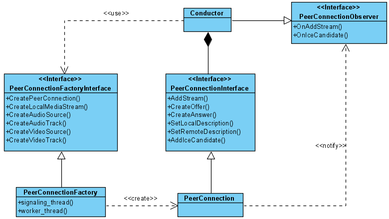 图中Conductor是该示例工程提供的核心业务类,整个WebRTC的使用都浓缩在这个类中。Conductor通过CreatePeerConnectionFactory方法创建了一个PeerConnectionFactoryInterface接口的实现对象,通过这个接口,可以创建关键的PeerConnectionInterface接口,PeerConnectionInterface接口是WebRTC的协议核心。此外,PeerConnectionFactoryInterface接口还提供了创建本地音视频流的功能接口,这个部分稍后再述。根据图中PeerConnectionInterface接口的成员方法可以看出,WebRTC通信流程的交互接口基本上都在这里面了,给Conductor的回调通知是通过PeerConnectionObserver接口来完成。具体的交互流程请参见上一篇博文。