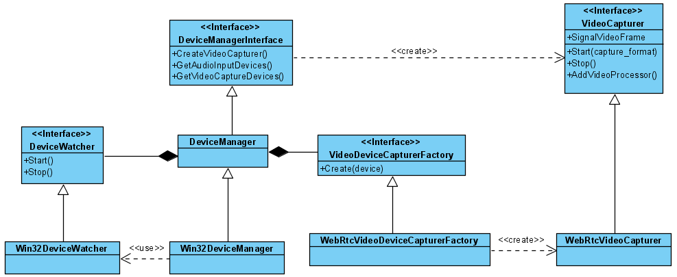 在介绍视频设备的采集之前,首先要分析一下WebRTC的DeviceManager结构,因为视频采集的抽象接口VideoCapturer的WebRTC原生实现就是通过它来创建的。这个类的功能还包括枚举音视频设备的相关信息等。结构如下:
