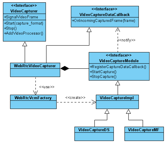 由于平台相关性,WebRtcVideoCapturer仍然不是视频采集的真正实现,它创建一个VideoCaptureModule接口对象来完成真正的视频采集工作。该抽象接口是视频采集的实现接口,最终在Windows平台下由VideoCaptureDS(传统的DirectShow方式)和VideoCaptureMF(Vista之后的Media Foundation API实现方式)来实现采集工作。这里要说明一下VideoCaptureMF在WebRTC中还是个空架子,还未真正实现,如果读者对Media Foundation API实现视频采集感兴趣,可以参考Chromium的media库中VideoCaptureDeviceMFWin类实现。