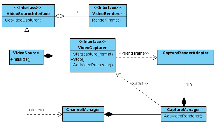 VideoSource是WebRTC对VideoSourceInterface接口的实现, 它容纳一个VideoCapturer对象做为视频采集源,VideoRenderer是供外部从VideoSource中获取视频帧数据。此外VideoSource还依赖ChannelManager对象,使用它所包含的CaptureManager来负责视频的采集任务。VideoSource在创建的时候就会调用 Initialize方法中调用ChannelManager的StartVideoCapture方法开始采集视频数据。CaptureManager内部为每个VideoCapturer对象维护了一个CaptureRenderAdapter,CaptureRenderAdapter在创建的时候将OnVideoFrame成员方法挂接上VideoCapturer的SignalVideoFrame信号来实时接收采集源传送过来的视频帧数据,OnVideoFrame内部将接收到的视频帧数据分发给向其注册的VideoRenderer对象(VideoRenderer对象的注册的流程是VideoSource到ChannelManager,再到CaptureManager,最后注册到CaptureRender Adapter与特定的VideoCapturer关联)。