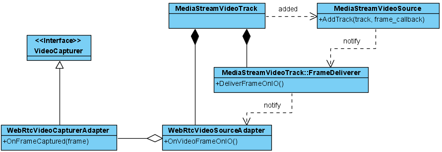 Chromium自己也封装了Track、Source概念,所以当初看这块的时候脑袋不容易转弯费了不少心思。WebRtcVideoCapturerAdapter需要接收Chromium的视频采集模块传输过来的帧数据,通过一层层的挂接,最终挂接到MediaStreamVideoSource类中。MediaStreamVideoSource接收到视频帧数据时,再一层层地通知回来,最终通知到WebRtcVideoCapturerAdapter的OnFrameCaptured方法,该方法内部触发SignalFrameCaptured信号。