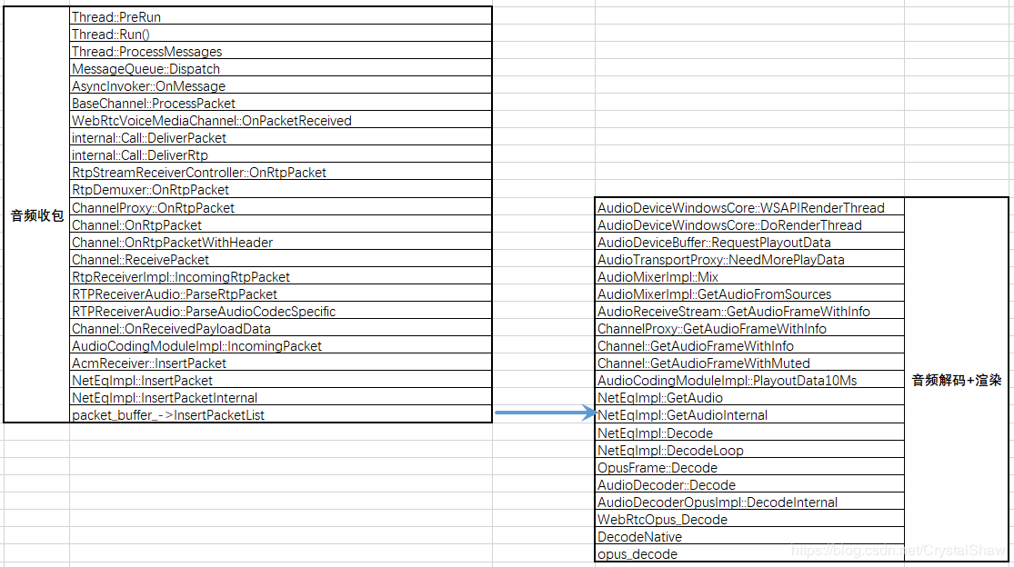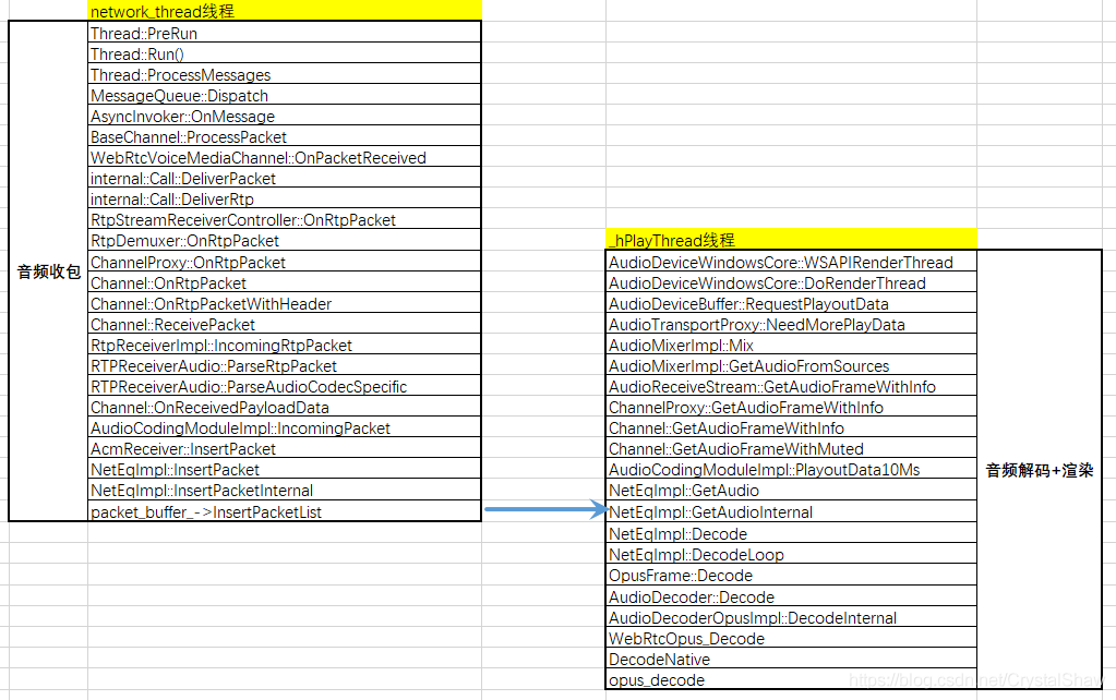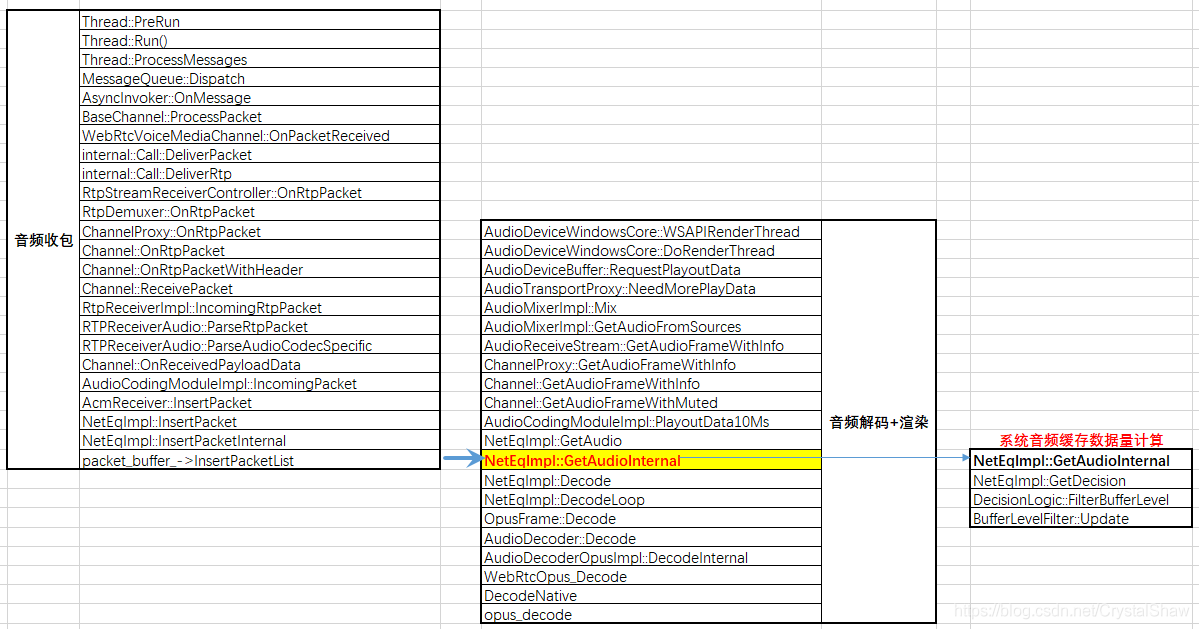 NetEqImpl::InsertPacketInternal函数与NetEqImpl::GetAudioInternal函数之间通过packet_buffer_共享队列传输音频报文数据。