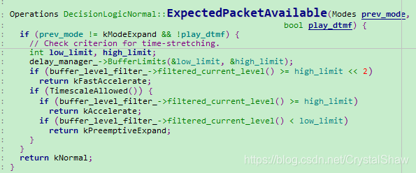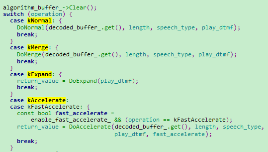 webrtc会根据网络延时(DelayManager)和缓冲BUF已经缓存数据长度(BufferLevelFilter)以及上一帧的处理方式等,决定给解码器发什么信号处理命令。
