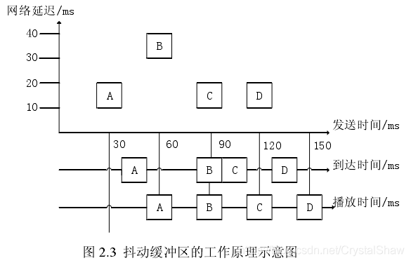 - 动态JB控制算法:计算目前最大抖动,调整缓冲区大小,实现复杂,网络抖动大时,丢包率低,抖动小时,延迟小。