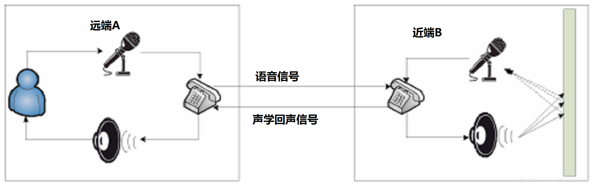 远端讲话者A-->麦克风A-->电话A-->电话B---->扬声器B--->麦克风B-->电话B-->电话A-->扬声器A--->麦克风A--->.........就这样无限循环。