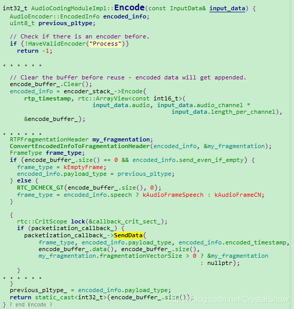 AudioCodingModuleImpl::Encode函数,同时调用编码+发包函数。